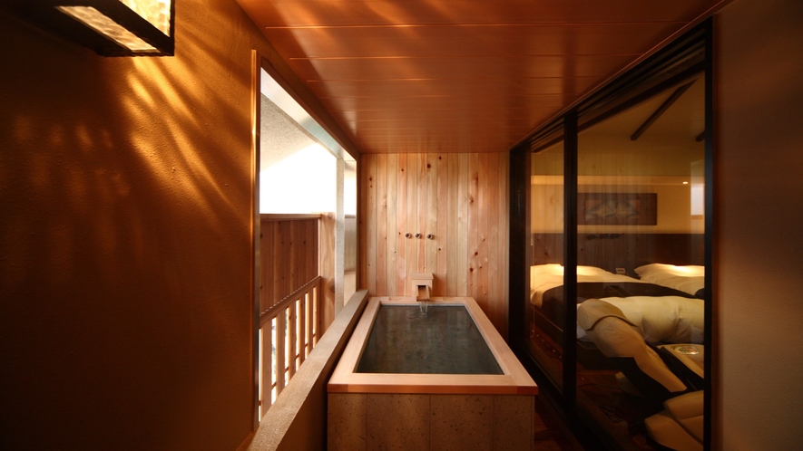 大展望露天風呂「棚湯」の中には、音響や光の変化により没入できる「音の湯」や包み込まれる贅沢を味わえる「樽湯・升湯」など非日常の湯浴みが実現。